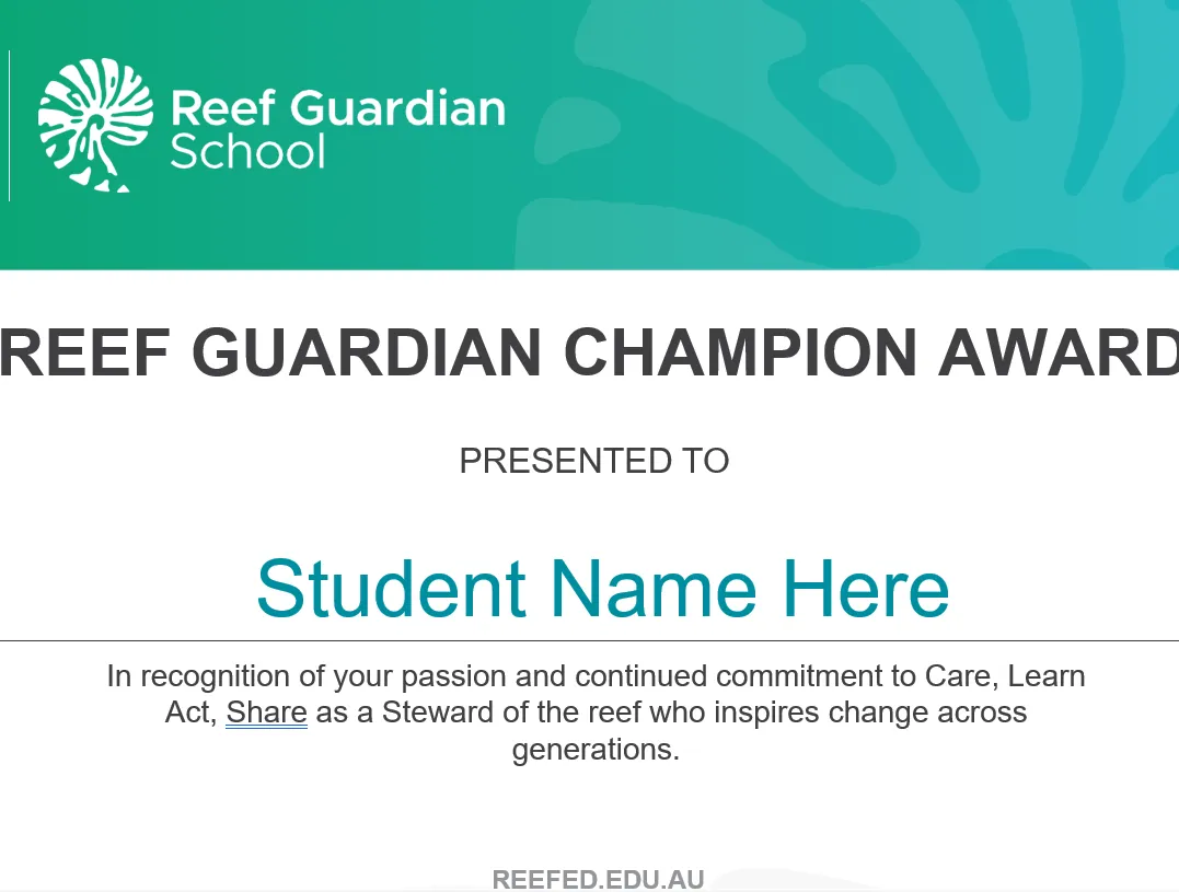 If you have a student who has been going that step above in reef, environment or sustainability efforts please consider awarding them this Reef Guardian Champion Award. We believe students' who Connect/Care, Learn, take Action or Share their knowledge are indeed the next generation of Stewards of the reef. We would love to help you celebrate their achievements, efforts and passion. Feel free to download and award where and as you see fit to the Reef Guardian Champions in your School.